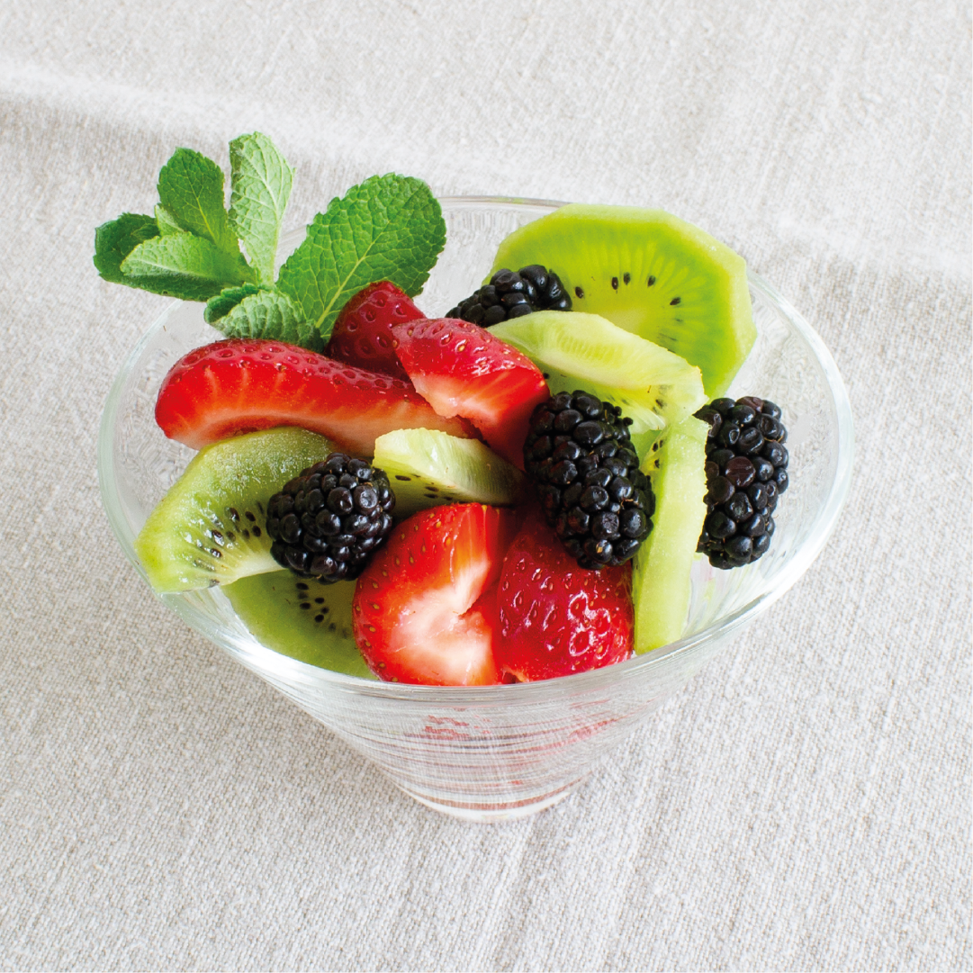 Bicchiere con banana, kiwi e more. Frutta lavata e tagliata lo stesso giorno della vostra consegna pronta per essere gustata.