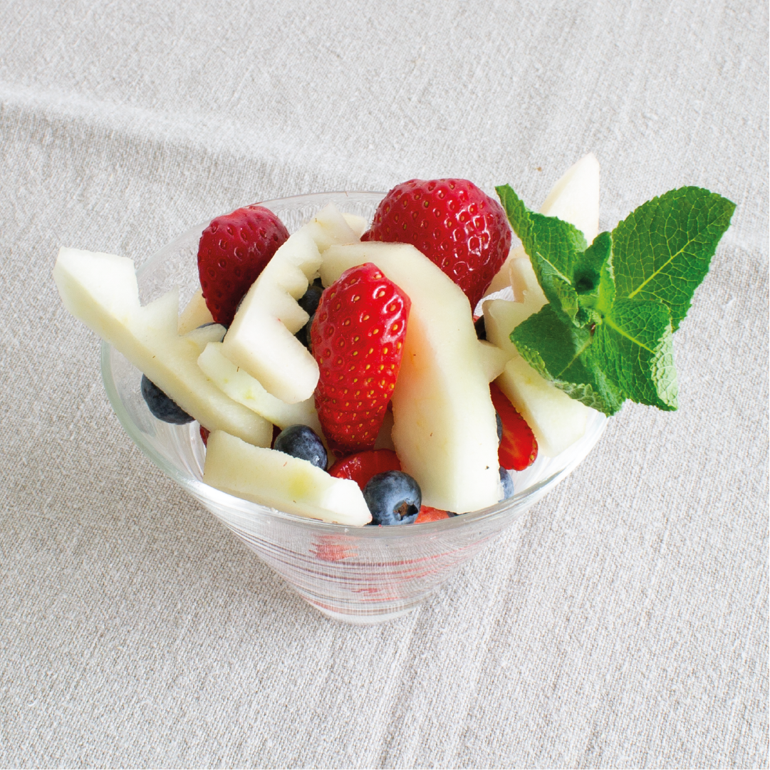 Bicchiere con fragole, pera e mirtilli. Frutta lavata e tagliata lo stesso giorno della vostra consegna pronta per essere gustata.