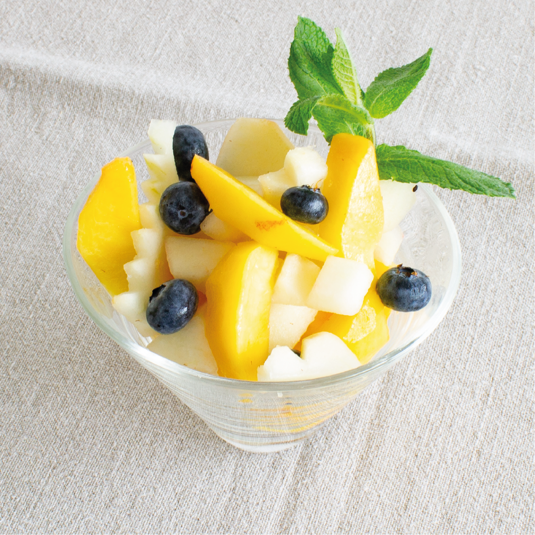 Bicchiere con pesca, pera e mirtilli. Frutta lavata e tagliata lo stesso giorno della vostra consegna pronta per essere gustata.
